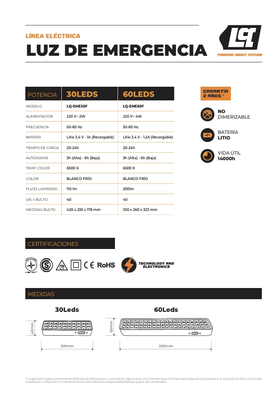 En momentos de corte de energía, contar con una luz de emergencia confiable es fundamental. La Luz Led de Emergencia Lusqtoff Electric, de la exclusiva línea Ferremax, te ofrece dos variantes con tecnología avanzada para que elijas la que mejor se adapta a tus necesidades: 30 LEDs y 60 LEDs.